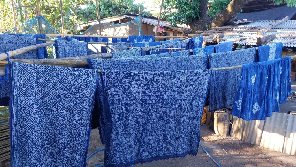 Indigo-dyed Hmong batik fabrics hang to dry, revealing intricate patterns created through traditional wax-resist techniques. Photo by: HNT